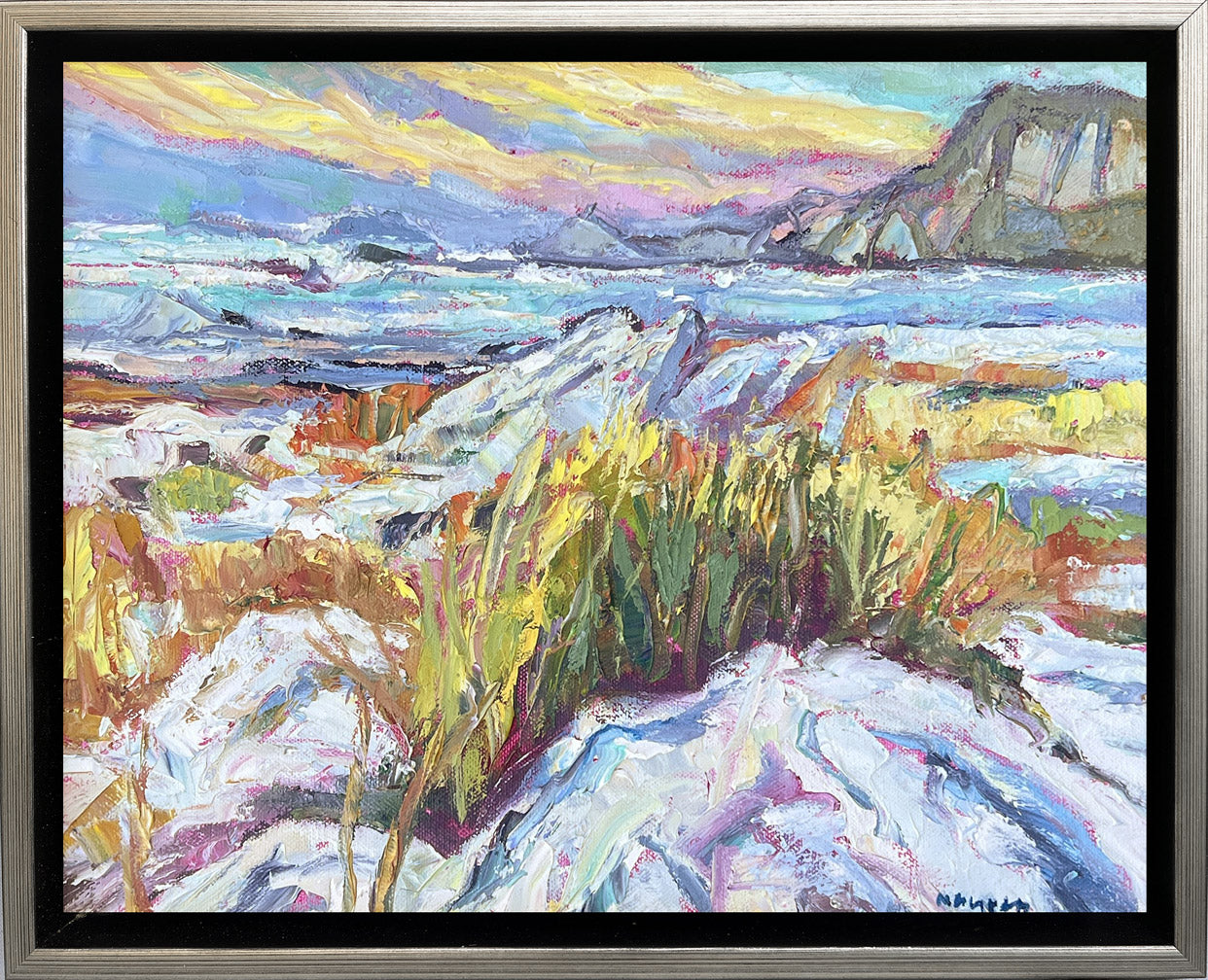 ORIGINAL Oil on canvas with brushed silver floater frame. Framed size: 32” H x 42” W x 2” D