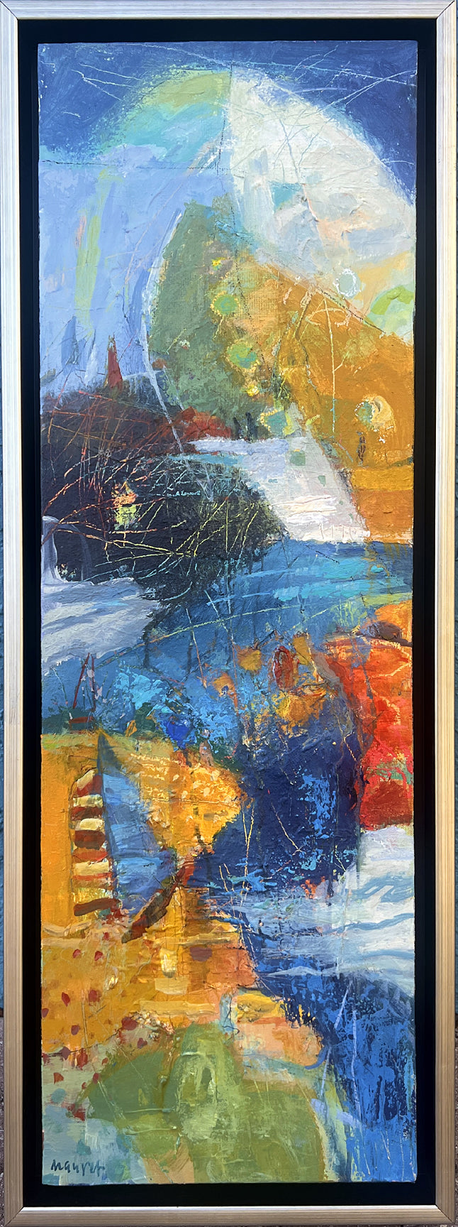 ORIGINAL Acrylic/mixed media on canvas with brushed silver floater frame. Framed size: 20” H x 26” W x 2” D