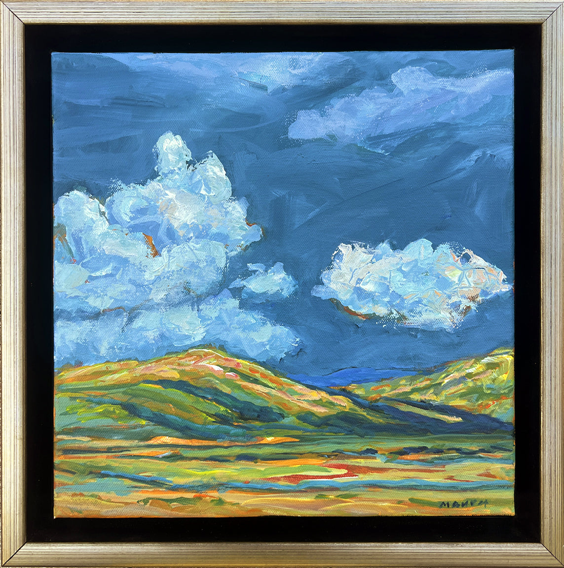 ORIGINAL Acrylic on canvas with brushed silver floater frame. Framed size: 22” H x 22” W x 2” D