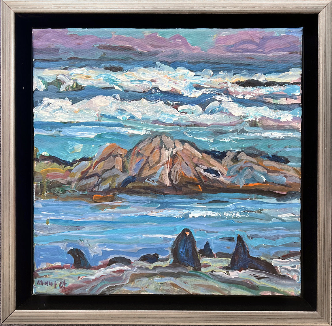 ORIGINAL Acrylic on canvas with simple pine frame. Framed size: 14.5” H x 11.5” W x 1.5” D