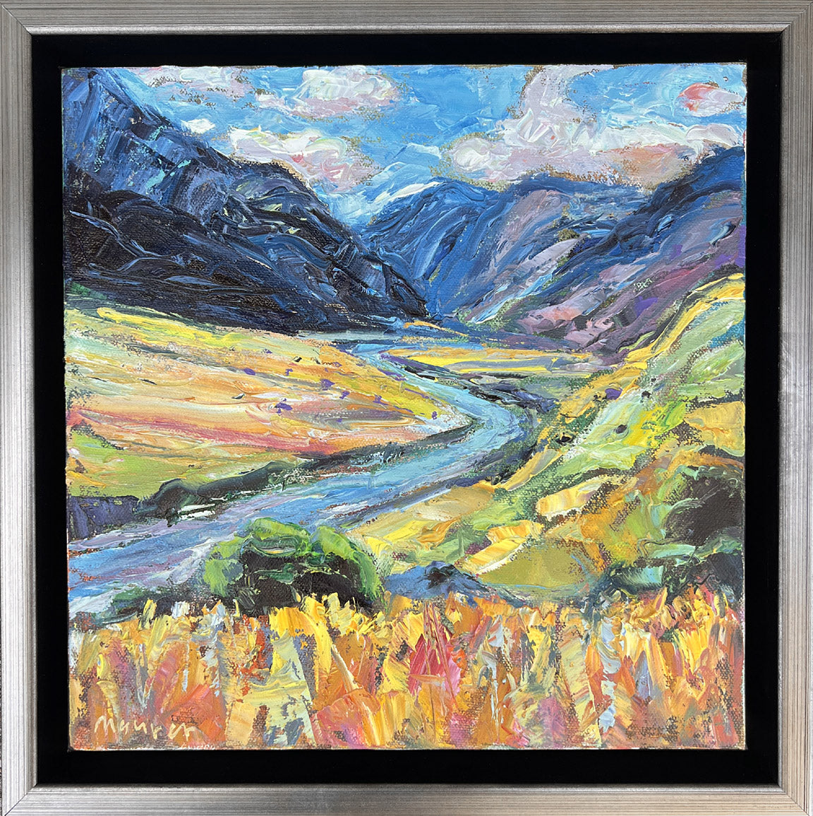 ORIGINAL Oil on canvas with brushed silver floater frame. Framed size: 18” H x 18” W x 2” D